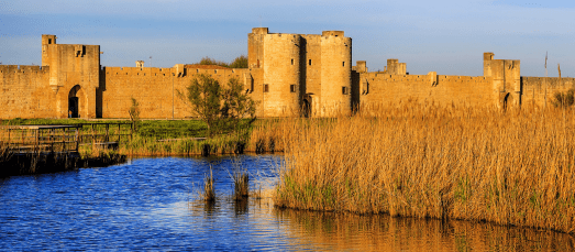 Das Dorf Aigues-Mortes („totes Wasser“) war ein Ausgangshafen für die Kreuzzüge und trotzt seinem unattraktiven Namen mit honigfarbenen Steinhäusern und grünen Plätzen. Ein Spaziergang auf den gut erhaltenen Stadtmauern bietet einen Blick aus der Vogelperspektive auf die Stadt und die benachbarten Salzteiche in Salins de Aigues-Mortes…